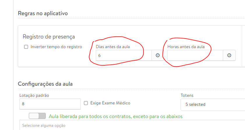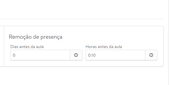 O mesmo ocorre para o cancelamento das aulas, você deve utilizar o campo abaixo para configurar quanto tempo antes de iniciar a aula ficará disponível a opção de cancelamento.