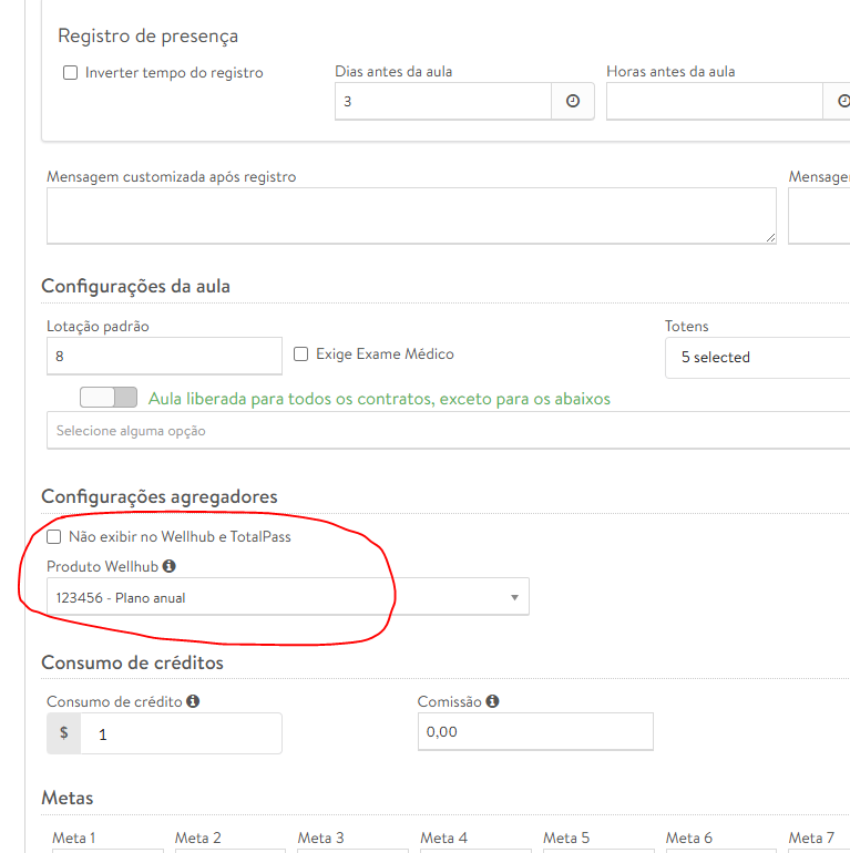 Outra configuração importante, é do Produto que será vinculado à essa aula. Você deve selecionar no campo abaixo, um dos produtos cadastrado no momento da ativação da integração com a Wellhub.