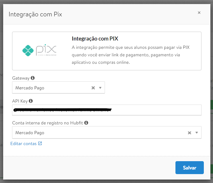 Na opção de Gateway, seleciona a opção de Mercado Pago, cole o Access Token que copiou do Mercado Pago e no último campo, selecione uma conta bancária interna do Hubfit para vincular os pagamentos por PIX e clique em salvar.