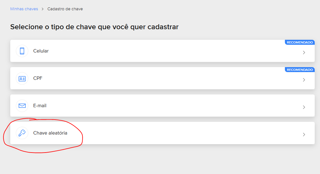Escolha a opção Chave aleatória e pronto. Não precisa copiar nada aqui, essa etapa serve apenas para o pix ser ativado através de uma chave aleatória e que só funcionará através da integração.