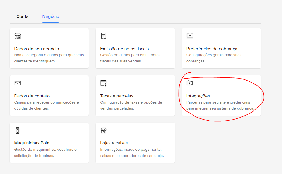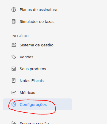 Após o login, clique no menu Seu Negócio e depois em Configurações: