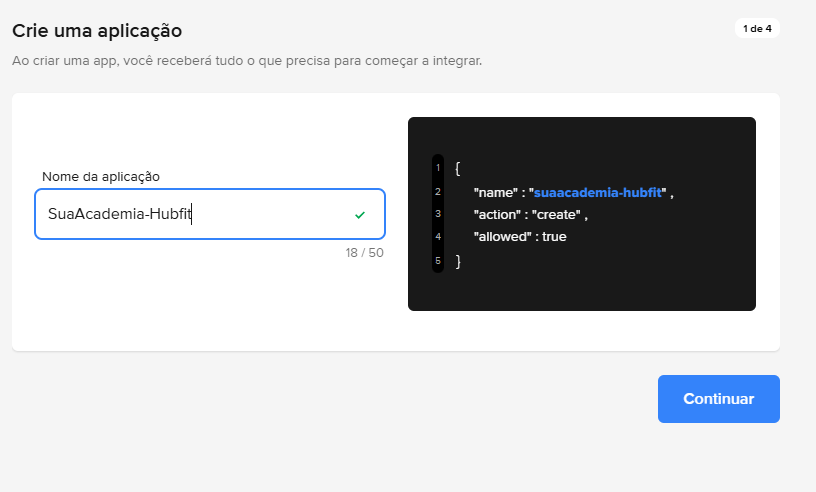 Na página de criação do aplicativo, preencha um nome para a aplicação. Pode ser esse padrão: {Nome da sua empresa - Hubfit}