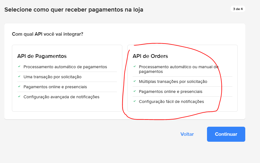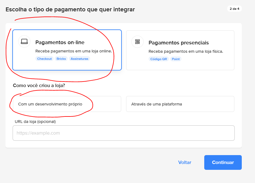 Selecione Pagamentos On-Line e depois a opção "Com um desenvolvimento próprio". O campo da URL pode deixar vazio.