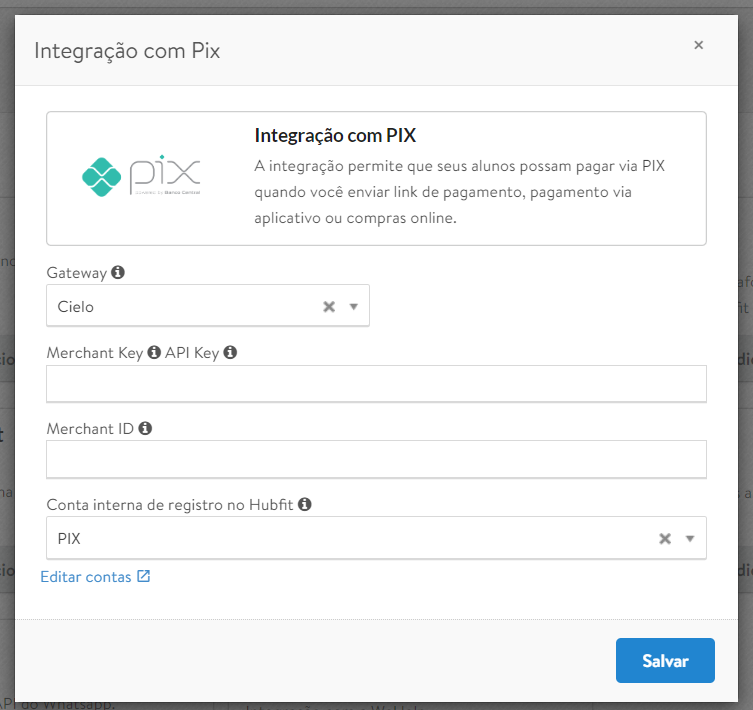 Escolha a opção do gateway da Cielo e insira os 2 códigos nos campos abaixo além de definir qual é a conta bancária interna do Hubfit que será vinculado os recebimentos em PIX.